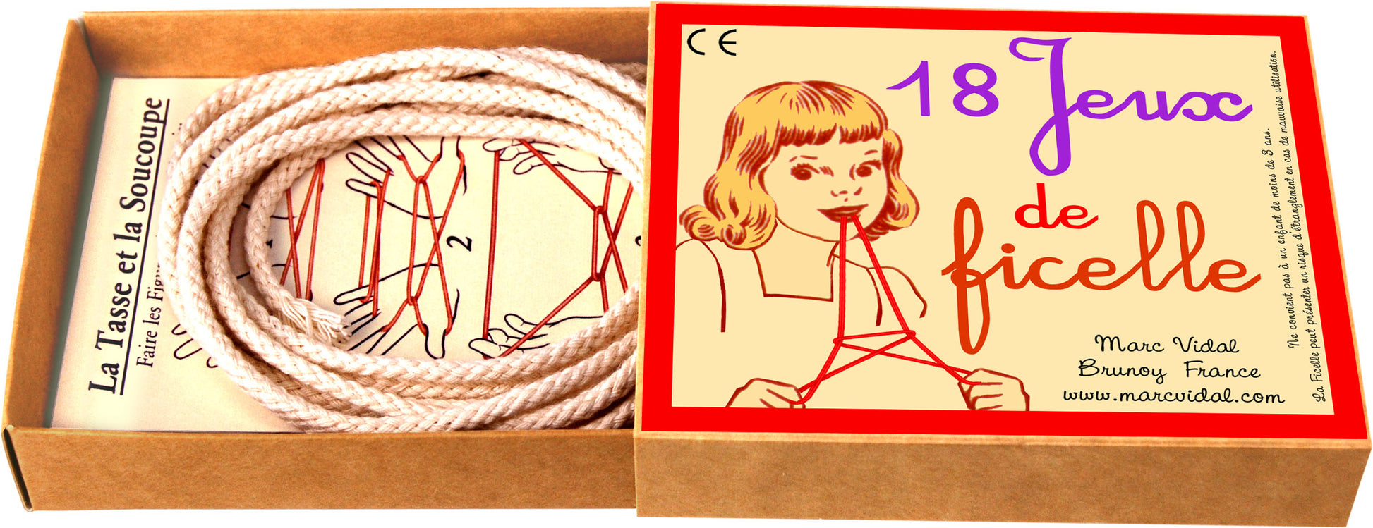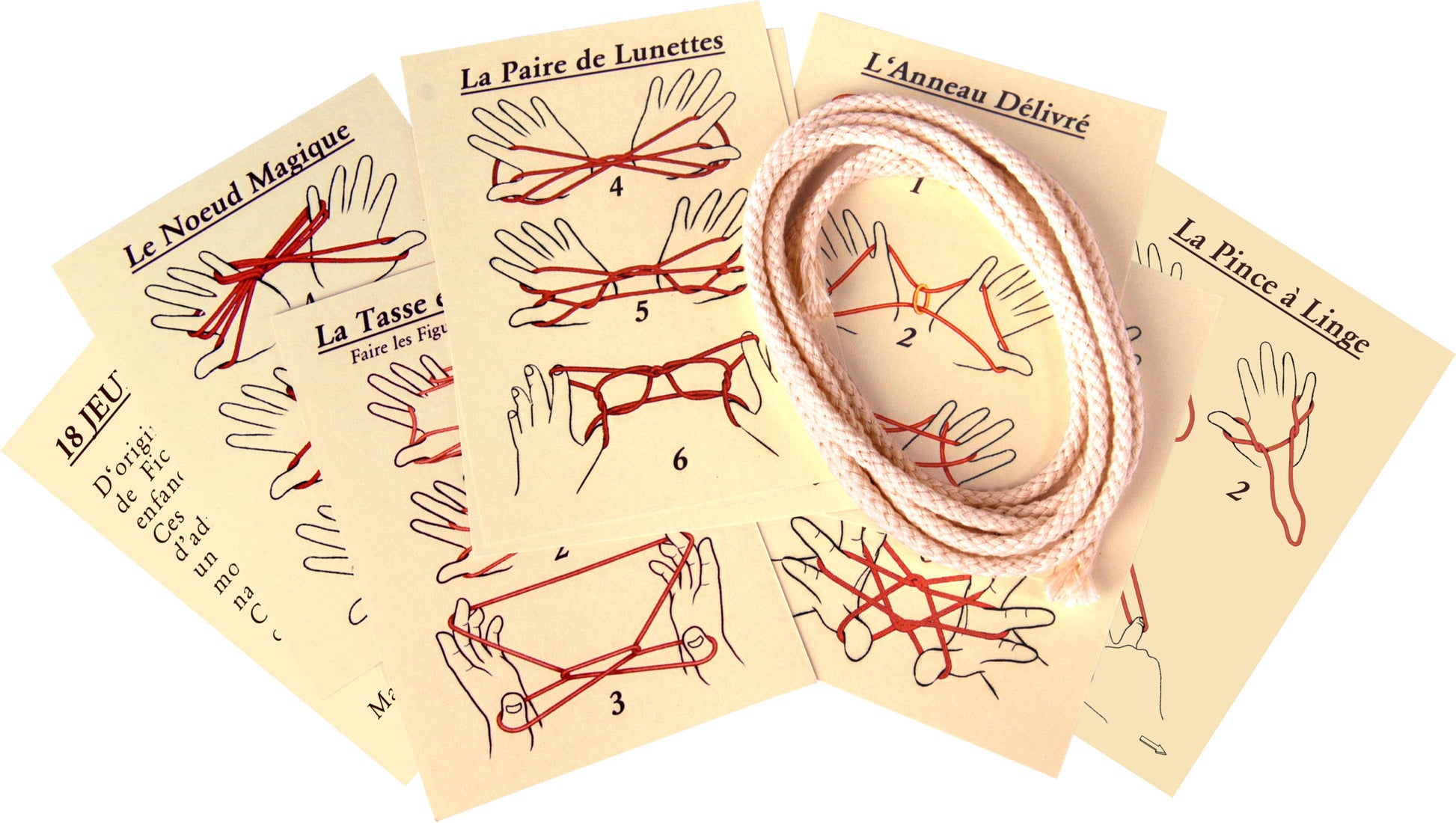 Die Schachtel enthält 18 mehr oder weniger schwierige Fadenspiele. Mach damit einen Knopf und toi, toi, toi!