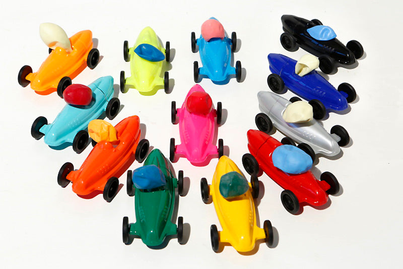 Das Auto kommt in 13 verschiedenen, knalligen Farben in einer Karton Schachtel mit Sichtloch damit die Farbe des Autos erkennbar ist.