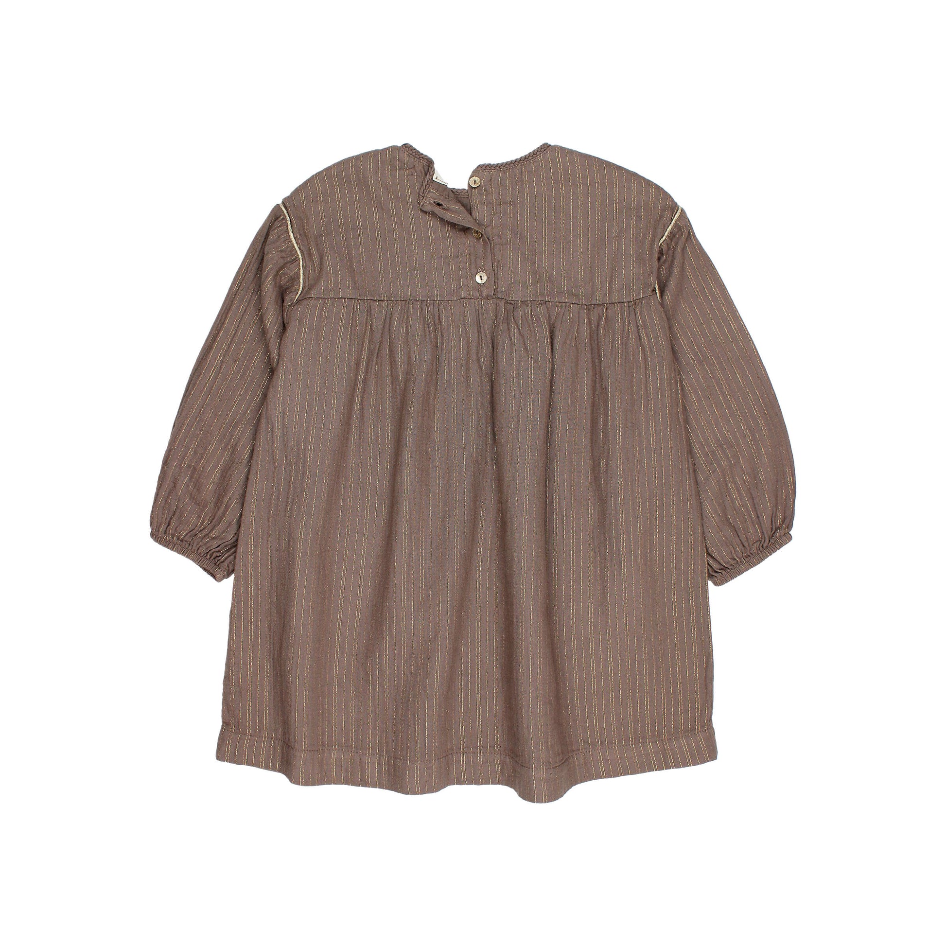 Blusenkleid aus doppellagiger Gaze mit feinen Lurexstreifen. Lange Puffärmel. Rundhalsausschnitt mit geflochtenem Detail. Knopfverschluss am Rücken. Lurex-Paspelierung an Passe und Armausschnitten.