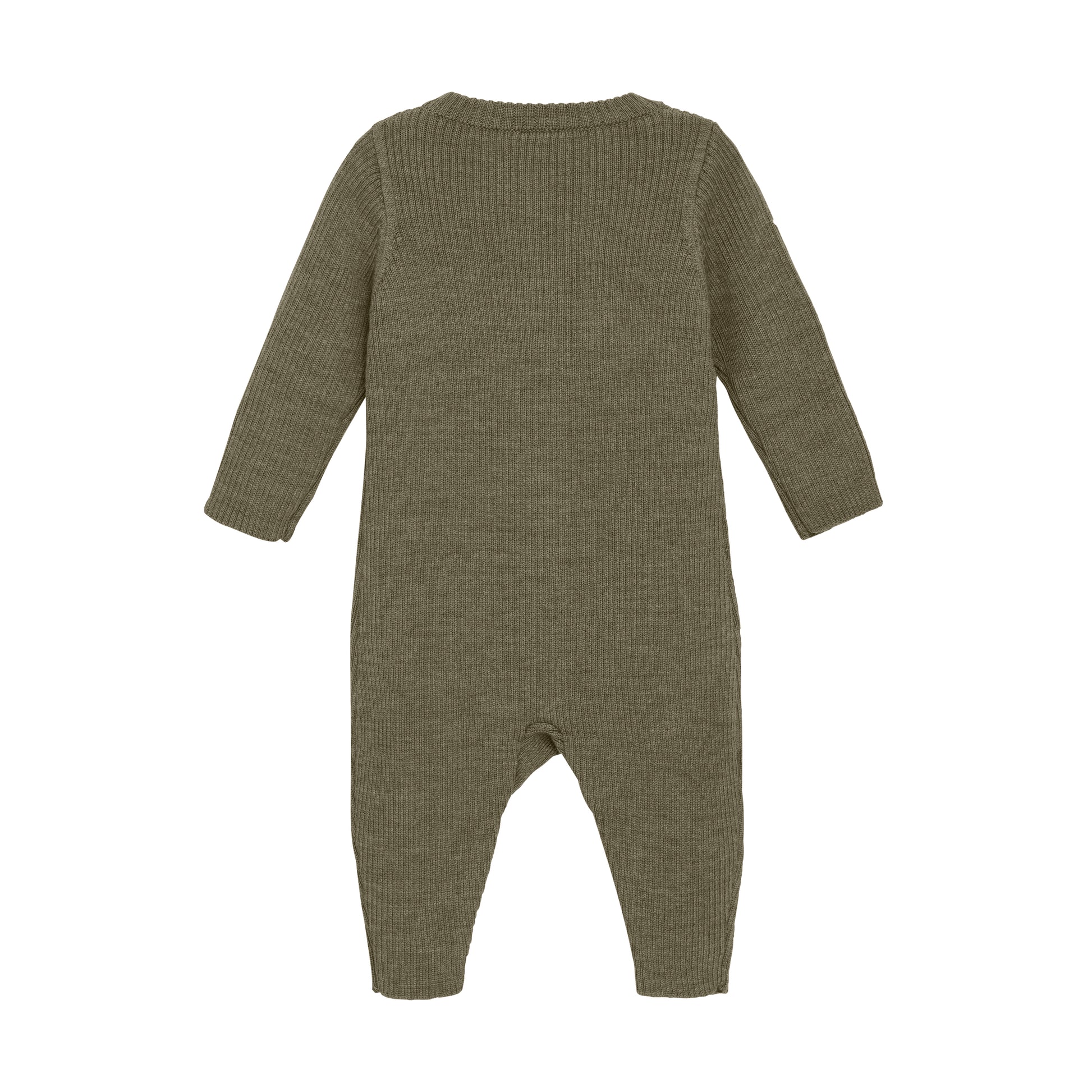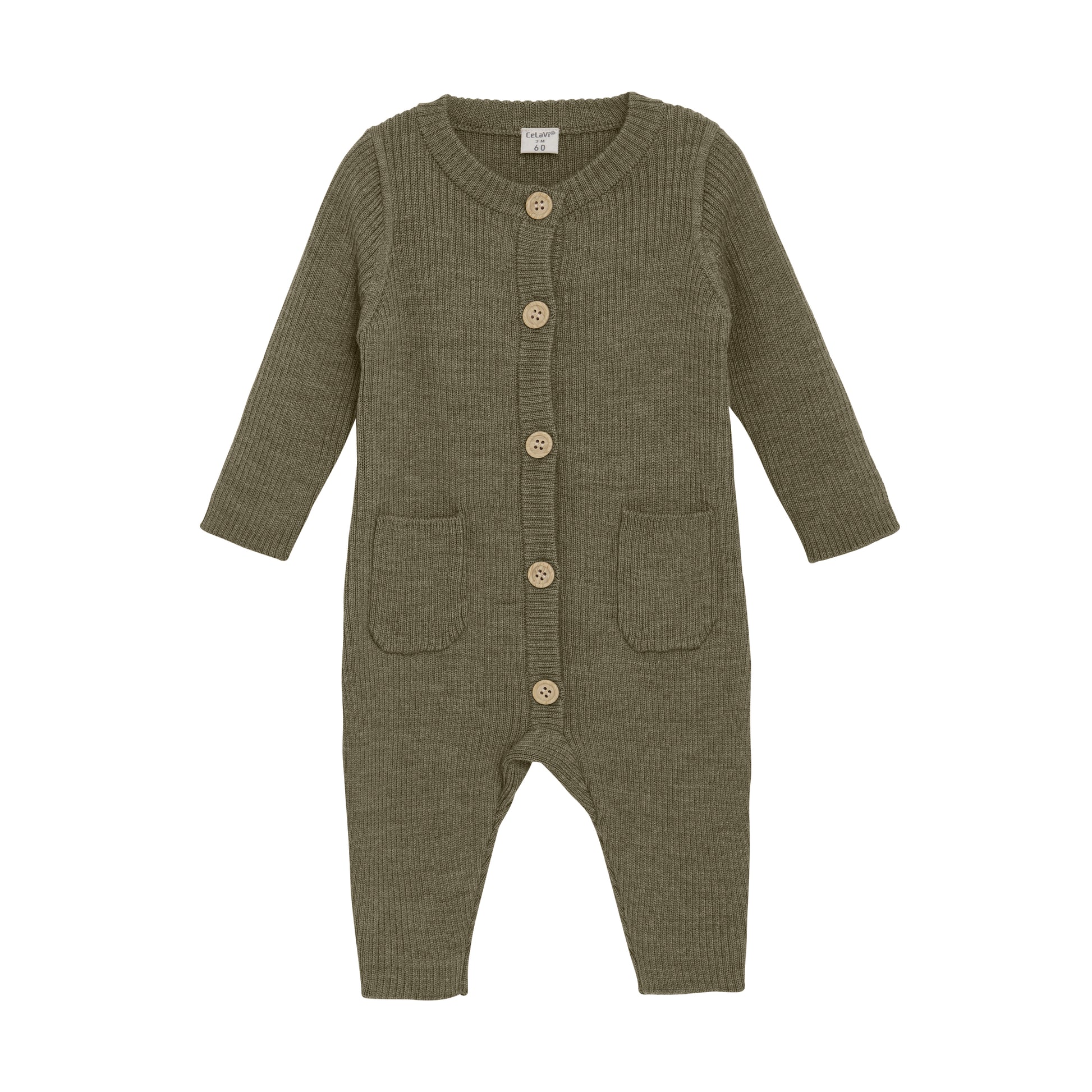 Langärmeliger, einfarbiger Strick-Jumpsuit aus 100% Merinowolle von CeLaVi. Der Anzug lässt sich mit Knöpfen vorne öffnen, so dass er leicht an- und ausgezogen werden kann.