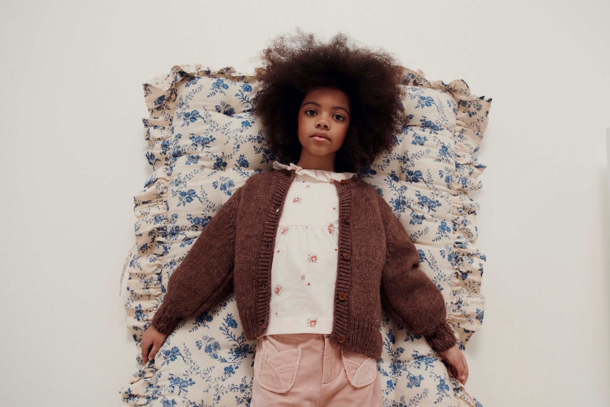 Strickjacke aus Merinowolle und kastanienbrauner Baumwolle, die sich durch ihre Weichheit und Geschmeidigkeit auszeichnet.