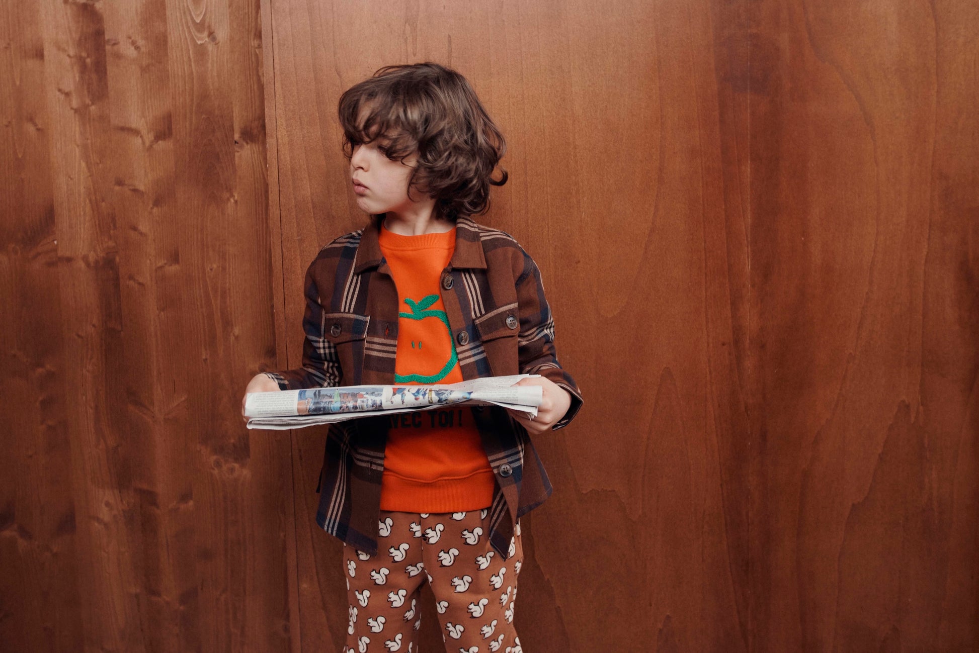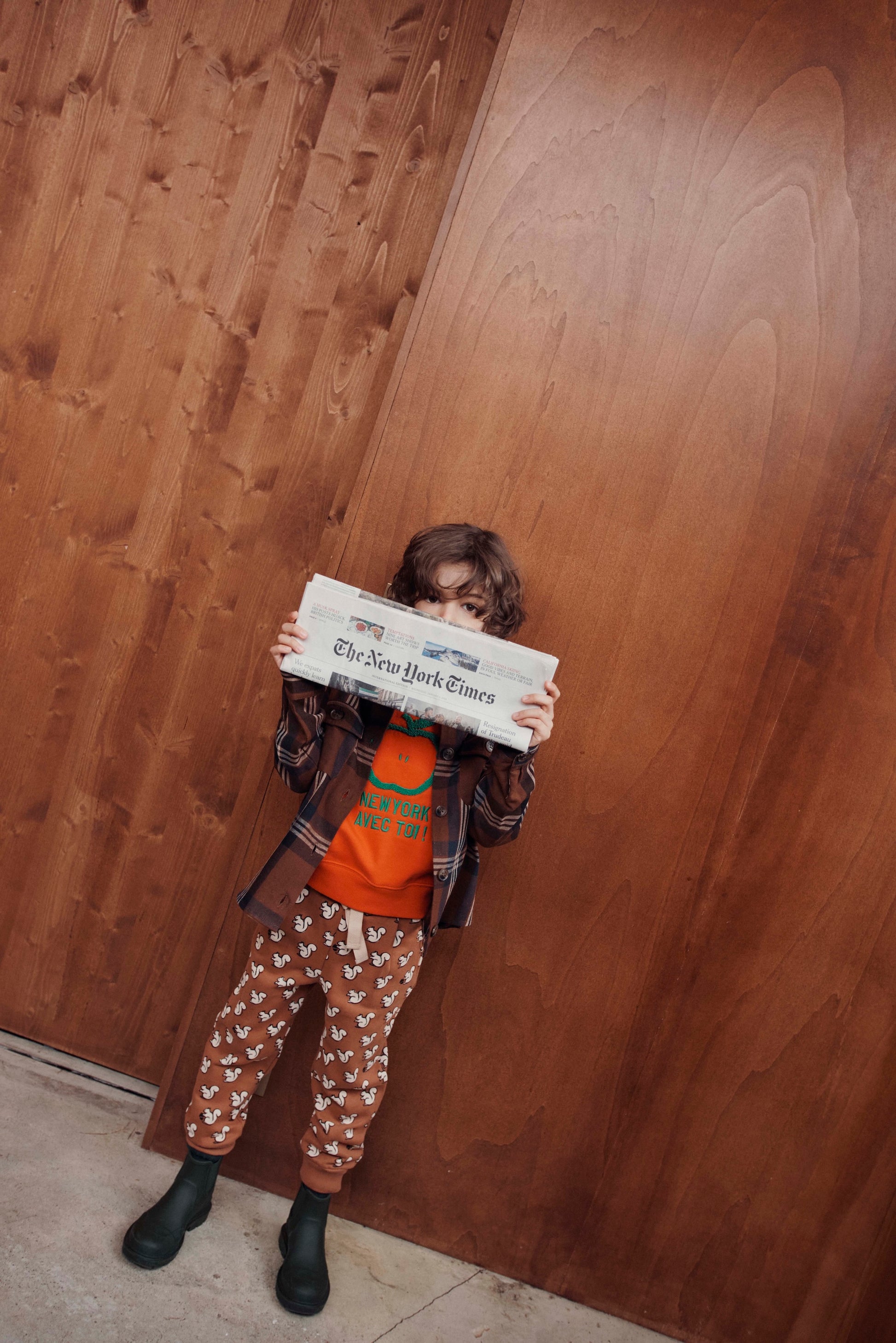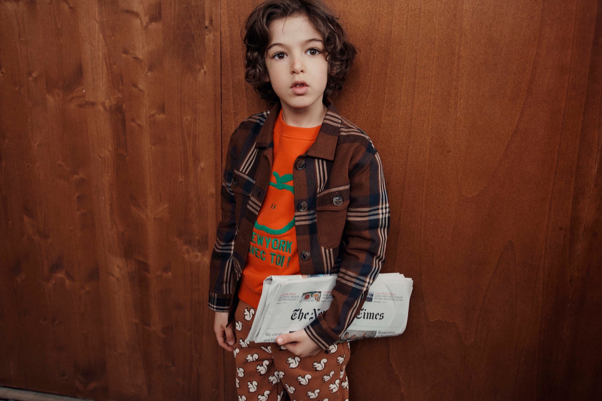 Sweatshirt aus weichem Bio-Baumwolljersey in der Farbe Clementine. Auf der Vorderseite prangt das Wahrzeichen von New York: ein großer Apfel aus grüner Bouclé-Stickerei, ergänzt durch den Schriftzug „New York avec toi” (New York mit dir).