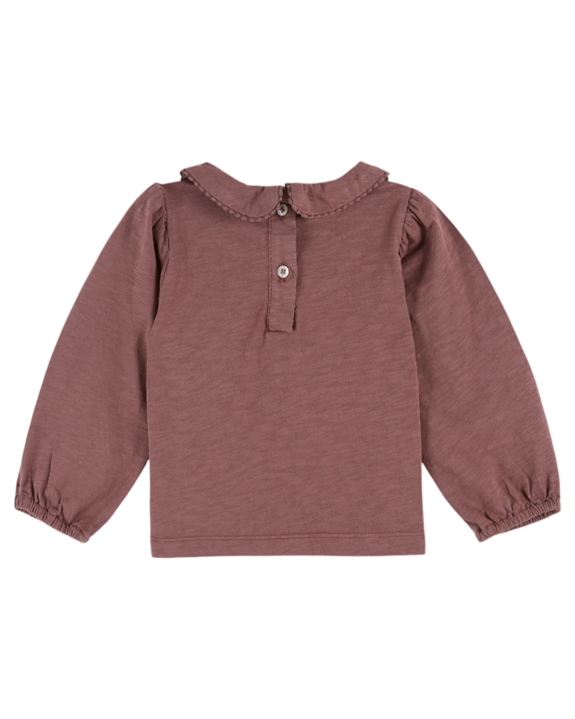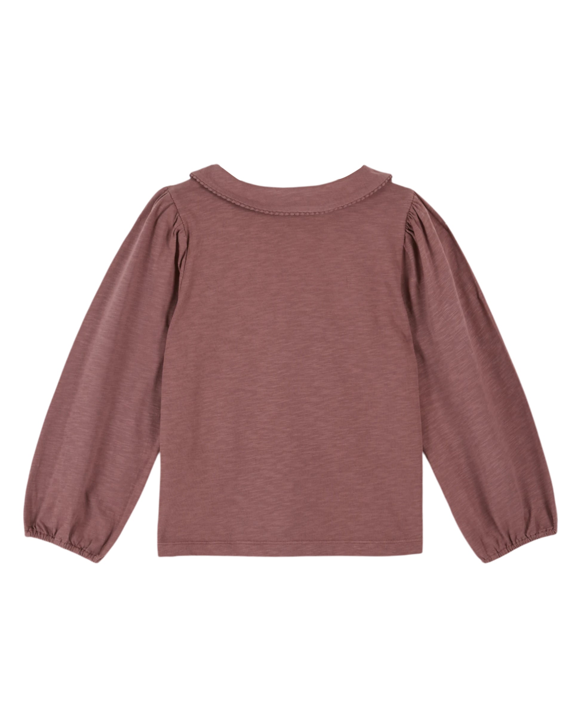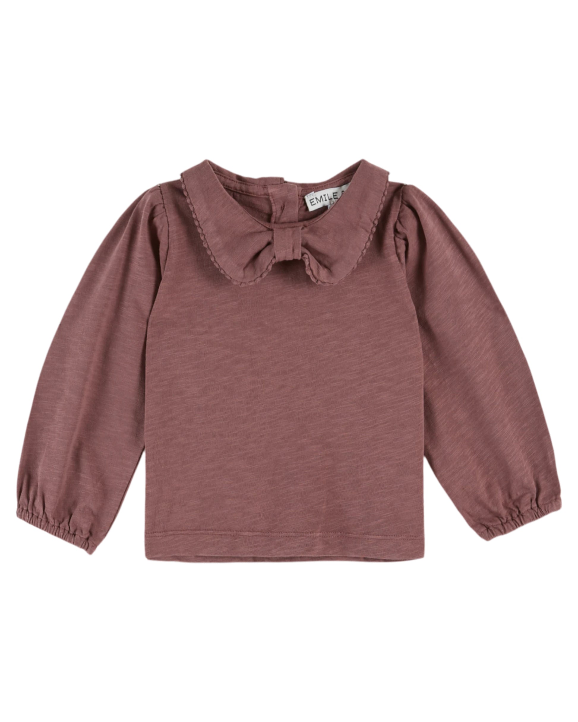 T-Shirt aus violettem Bio-Baumwolljersey mit einem kleinen Kragen, der mit einer tonalen Bogenborte verziert und unter dem Kinn gerafft ist.