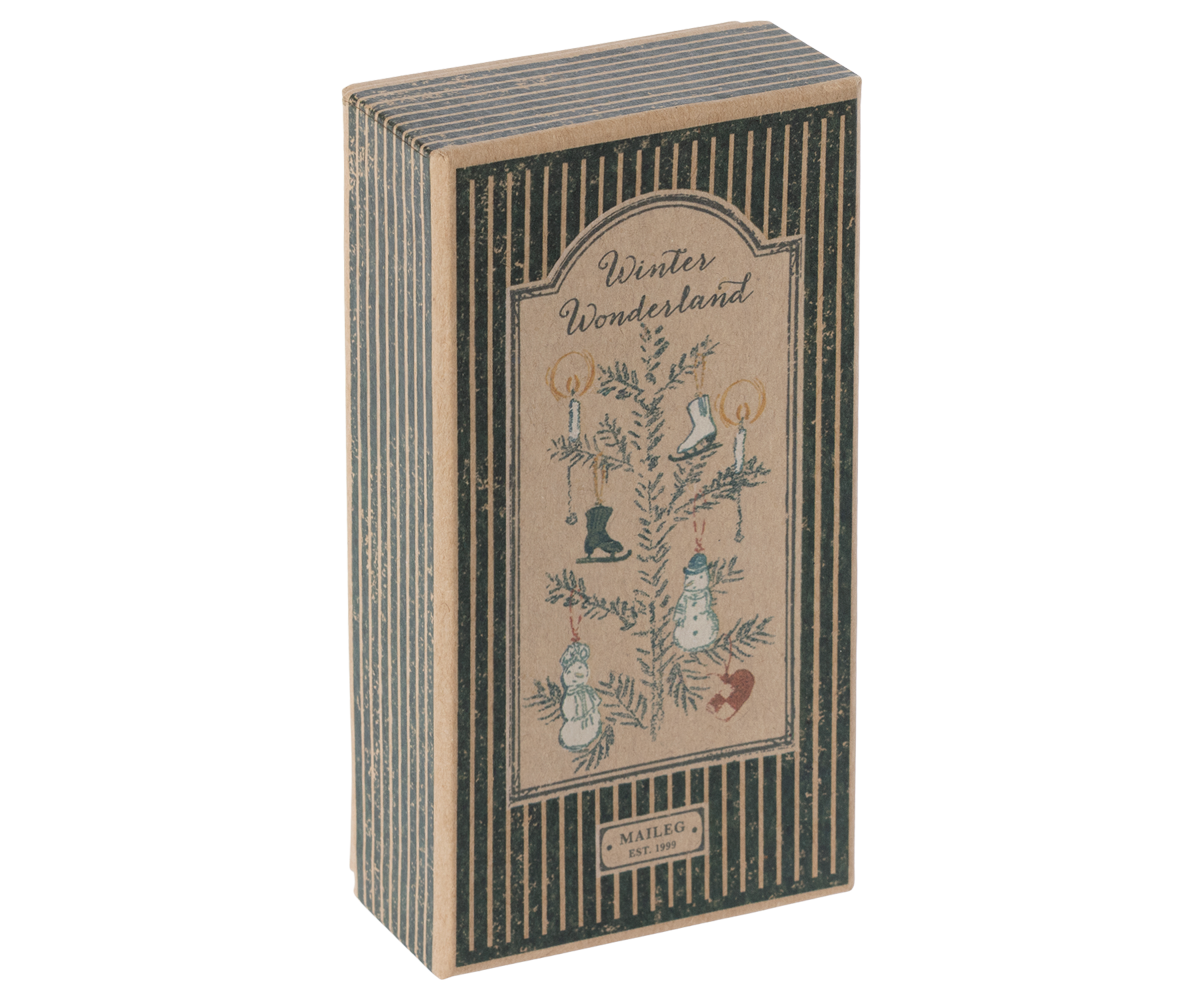 Eine perfekte Geschenkbox mit 4 schönen Maileg-Ornamenten. Jedes Ornament ist in Seidenpapier eingewickelt und in einer Geschenkbox verpackt, die mit den Zeichnungen von Dorte Mailil verziert ist. Dieses Set enthält einen Schneemann, seine Frau und 2 Schlittschuhe.
